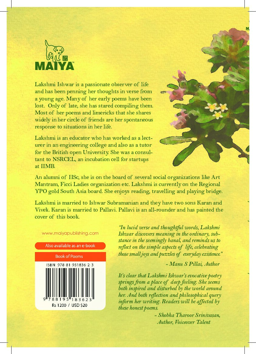 Lakshmi Ishwar is a passionate observer of life and has been penning her thoughts in verse from a young age. Many of her early poems have been lost. Only of late, she has started compiling them. Most of her poems and limericks that she shares widely in her circle of friends are her spontaneous response to situations in her life.